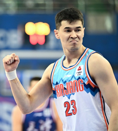 新疆伊力特队球员阿不皆沙拉木在比赛中庆祝。